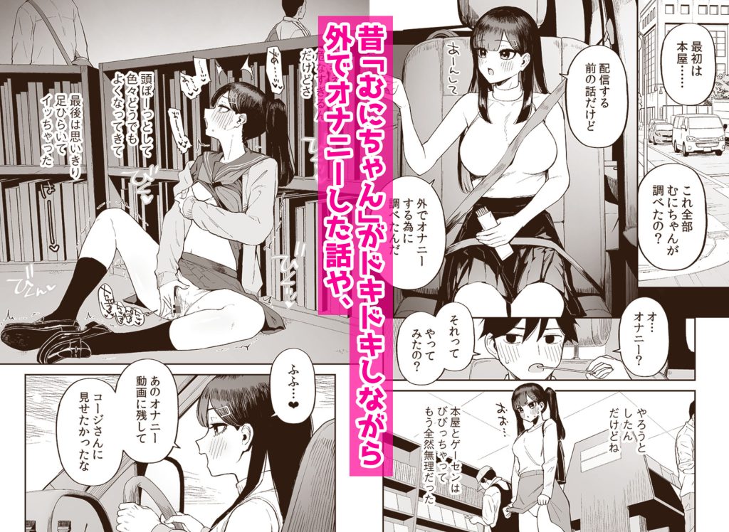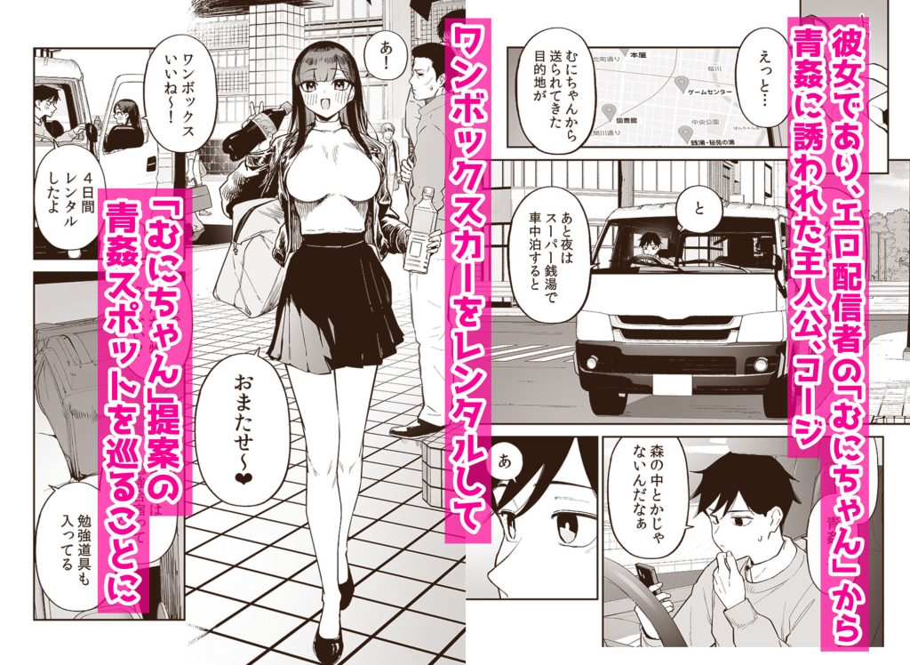 大好きなエロ配信者「むにちゃん」から青姦巡りに誘われた主人公のコージ。ワンボックスカーに泊まりながら各場所へ向かい、二人が青姦に挑む。誰にもみつからずやろうとしたが……